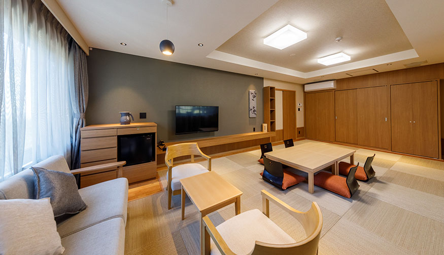 信楽焼の陶器風呂を備えた上質な空間で、四季折々の景色を愉しむ贅沢なひとときを。ポンプアップ式で清潔さを保つ露天風呂や、フラットな設計が快適な滞在を実現。シンプル和モダンの趣あるお部屋で、特別な時間をゆっくりとお愉しみください。お部屋で岩盤浴の心地よさをご体感いただける「ヒーリング・ストーンカウチソファ」も導入しております